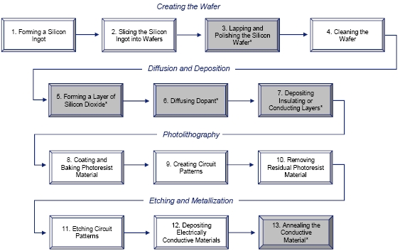 Semiconductor Industry. Semiconductors control and amplify electrical signals and are used in a broad range of electronic products, including: consumer electronic products, computers, wireless telecommunication devices, communications equipment, automotive electronic products, major home appliances, industrial automation and control systems, robotics, aircraft, space vehicles, automatic controls and high-speed switches for broadband fiber optic telecommunication networks. Semiconductors, or semiconductor chips, solar cells and optical components are manufactured primarily on a silicon wafer and are part of the circuitry or electronic components of many of the products listed above.